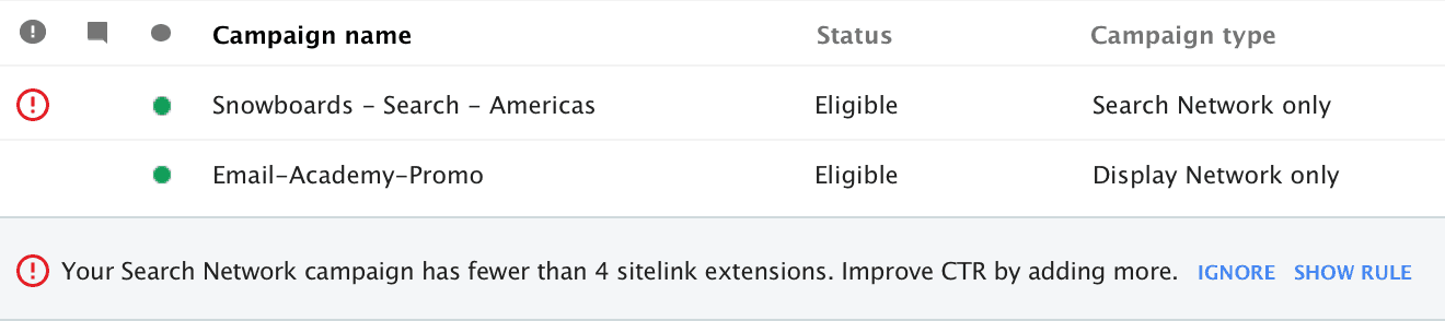 For example, if you want all of your search ads to contain four or more sitelinks as Google suggests, you can set that as a custom rule. AdWords Editor will then alert you of campaigns or ad groups that are not following your custom rules.